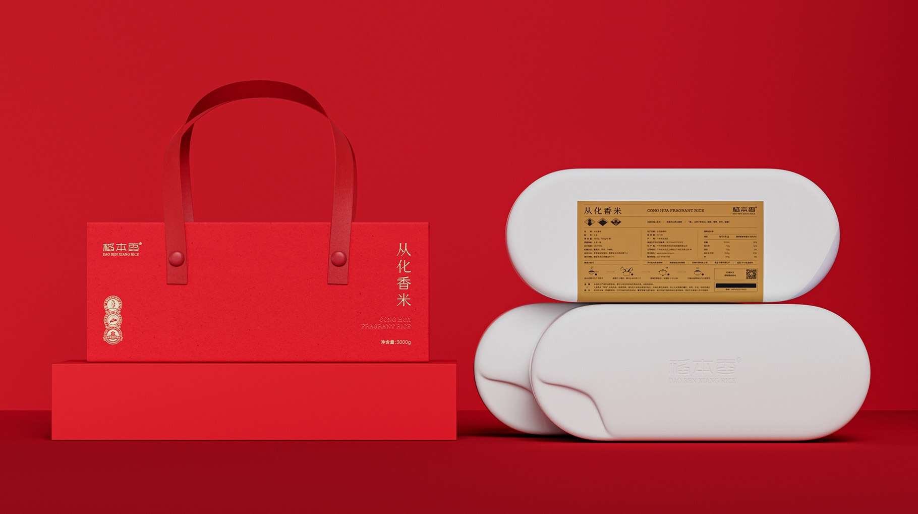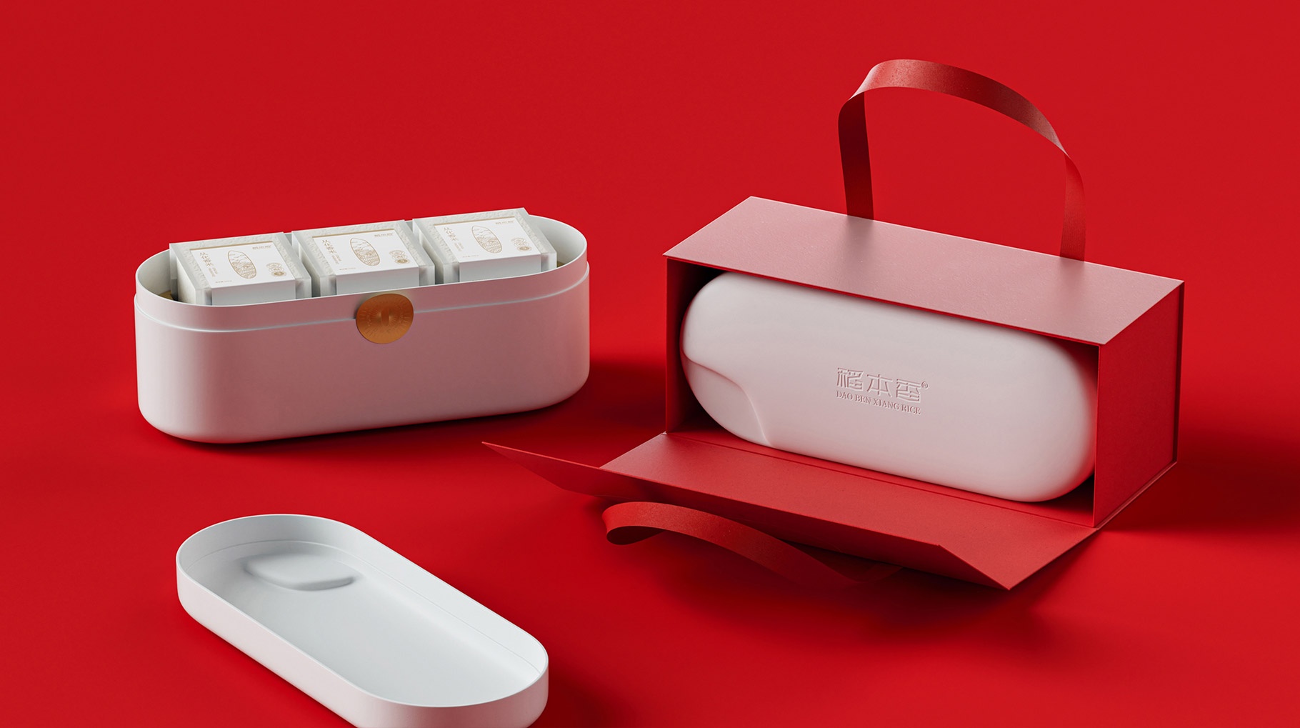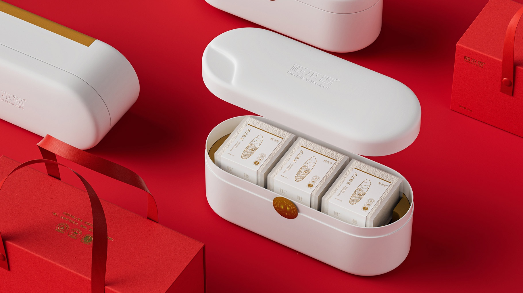 我們對本次稻本香高端香米禮盒設計,以具有很強符號感儀式感的手提包式創意設計來打造產品外包裝,為我們日常送禮帶來一份具有儀式感產品體驗,當我們打開禮盒的時候,直入眼簾一個白色具有質感的米粒造型讓我們感受到產品的品質感,內部米粒盒子用環保的甘蔗纖維材料沖壓而成,獨立封裝的一次體驗精致米磚,讓整體產品包裝看上去高端且具有品質感,從而賦能稻本香高端香米產品屬性。
