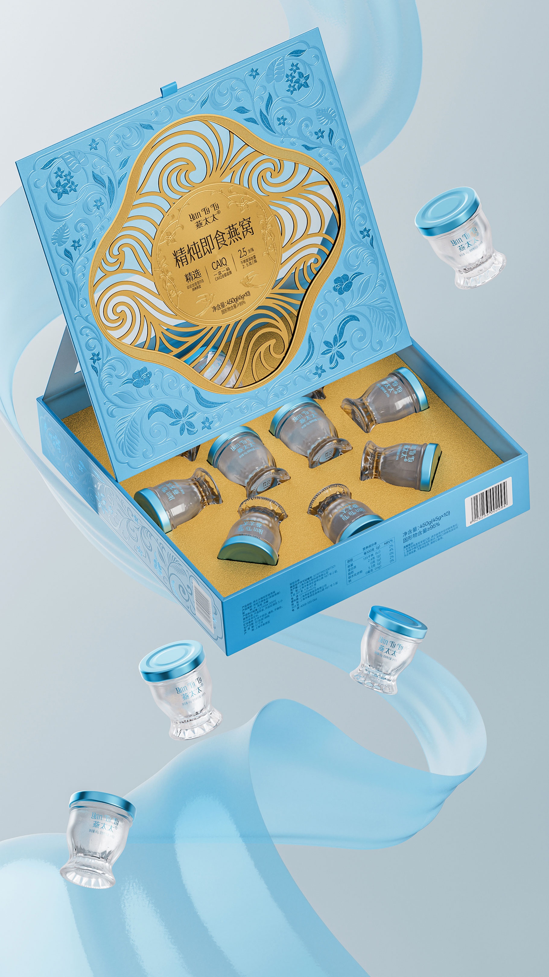 整體包裝創意以獨創三層視覺敘事:中部采用東方園林“框景”手法打造鏤空視窗,湖藍色藤蔓紋樣層疊延展,再現雨林生態的呼吸韻律,虛實交錯間透現燕窩瑩潤質感。
